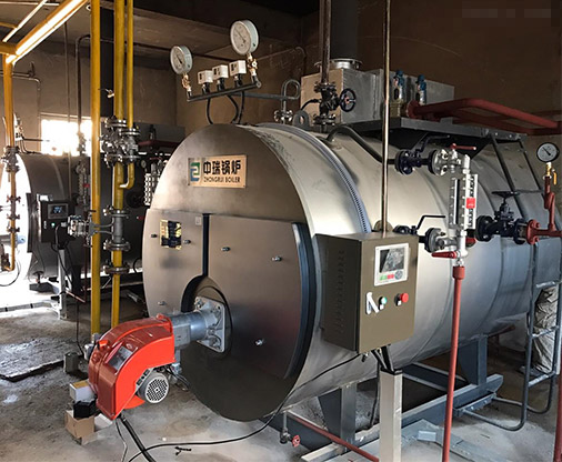 Zhongrui steam boiler is an electromechanical integration equipment, which consists of boiler body, burner, electric control cabinet, feed water pump and pipeline valve instrument. The unit is equipped with imported European burners. The unit body adopts the horizontal internal combustion three-return wet-back type of mature structure. The fuel (oil/gas) is sprayed from the burner through the pressure atomization at high speed, and it is slightly positive in the furnace. Compressed combustion, the high-temperature flue gas after combustion is turned into the second return pipe to the front smoke box after the radiation heat exchange in the furnace, and then turned 180o degrees into the third return pipe, and then discharged through the rear smoke box and the condenser. The chimney enters the atmosphere.